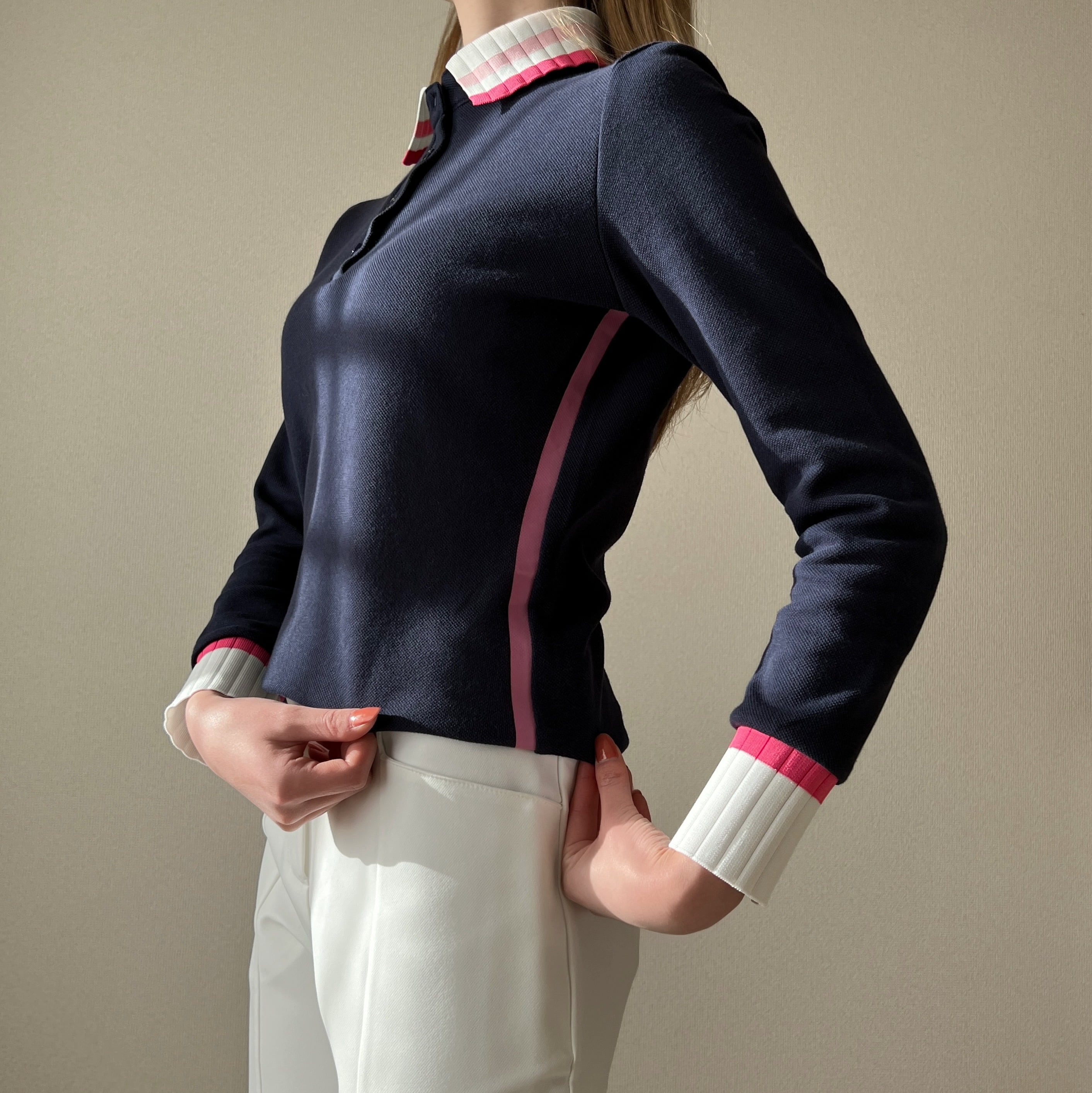襟と袖口部分にポイントカラーが入っていてベーシックながら遊び心のあるデザインとなっています。
